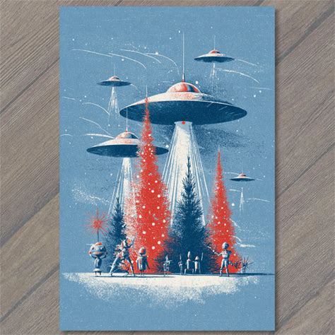 Art Print UFO Christmas Forest Aliens Holiday Lights Red Blue Retro Sci Fi Style. Papermaddogscar. Multicolor. Posters & Prints.
