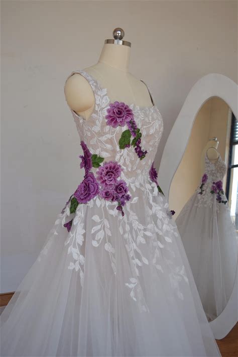 Purple Floral Lace Applique Wedding Dress// Square Neckline Romance Bridal Dress